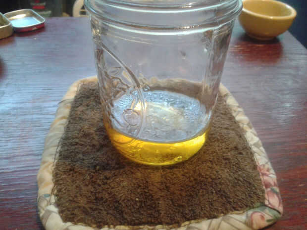para este paso, colocar la cera en el recipiente de vidrio y utilizar el horno de microondas en alta para derretir la cera en el líquido. (Esta cantidad se suelen tener 2-3 minutos en el microondas de 1100 Watt.) Por favor, recuerde usar una toalla o un sostenedor de pote como el recipiente estarán caliente!