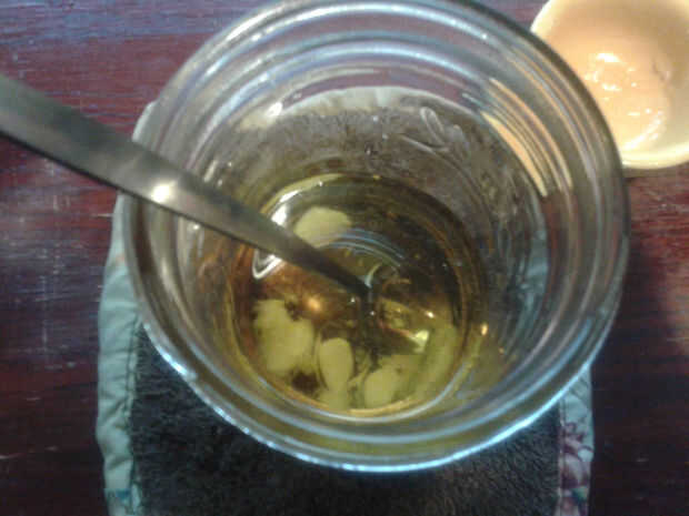 Una vez que la cera se derrita, necesita agregar el aceite de coco. Esto no sólo ayudará a ablandar la cera por lo que será mucho más fácil de aplicar, pero agrega aceites y nutrientes que ayudarán a mantienen tus labios nutridos y saludables. Cuchara el aceite de coco en la cera y revuelva hasta que se integra y no más grumos son accesibles.