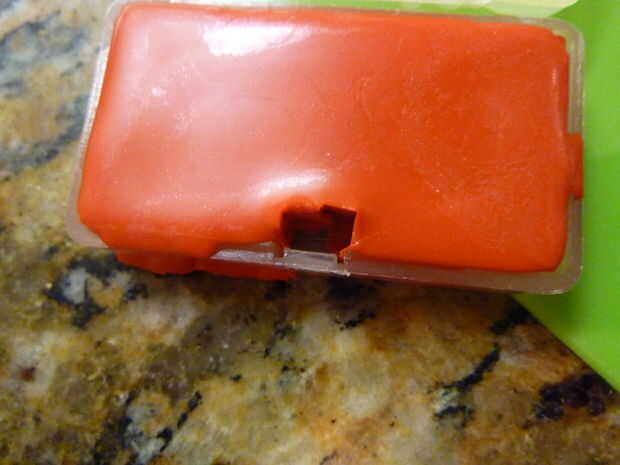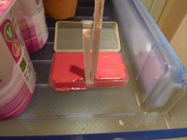 Luego ponerlo en la nevera durante 2 minutos. Después toma hacia fuera los palillos y debe ser un espacio pequeño hay. Había hecho de otro color y ponerlo en el otro lado del envase, luego ponerlo en la nevera otra vez. cuando había solidificado lo saqué y estaba listo para usar.