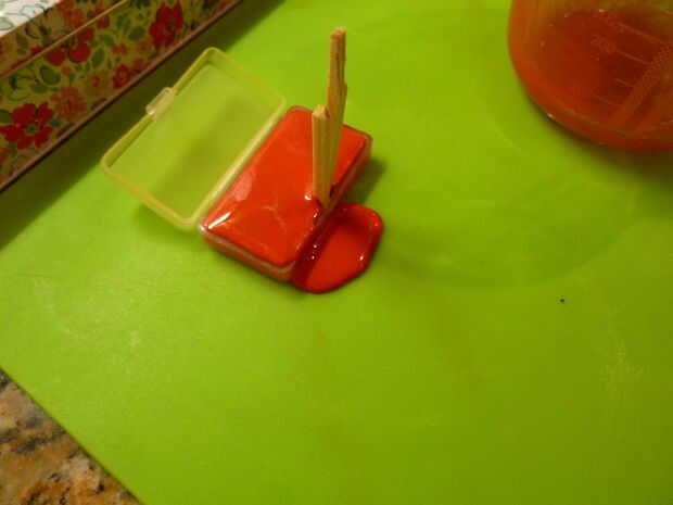 Verter el contenido de la jarra en su contenedor. Si, como el mío, el contenedor tiene una tapa que quede en el interior del recipiente, entonces poner dos algodón de azúcar/palitos en el lugar no quieres cualquier líquido como lo hice en la primera foto. No llene demasiado el recipiente (como hice yo) si hacéis otro color en la tapa como cuando tratas de cerrarla se mush juntos y aspecto repugnante. Esto sucedió antes de que me enteré que no sobrecargue una mina!