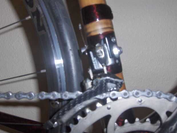 El desviador delantero esté en un ángulo extraño en relación con el plato. I taladrar los remaches que sujetan en su sitio y comenzó a jugar con la Asamblea para ver si podía alinear correctamente. Encontré la ubicación correcta y volver a orificios y cubrió nuevamente en su lugar con la pistola de remache. Se puede ver 2 de los agujeros de la colocación original, pero se esconde muy bien por toda la Asamblea, la manivela, cadena y cambio. Pero, sé que está ahí... Palabra que a los sabios - no te delante de ti, algunas cosas deben dejarse hasta el final.