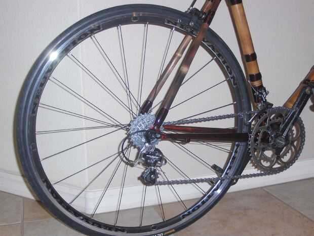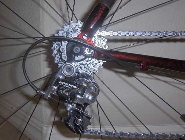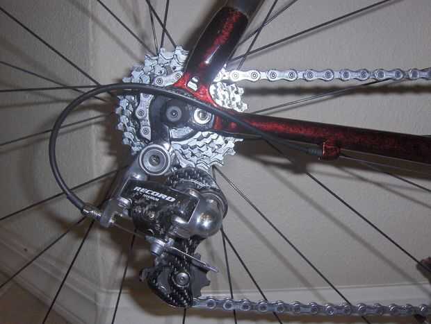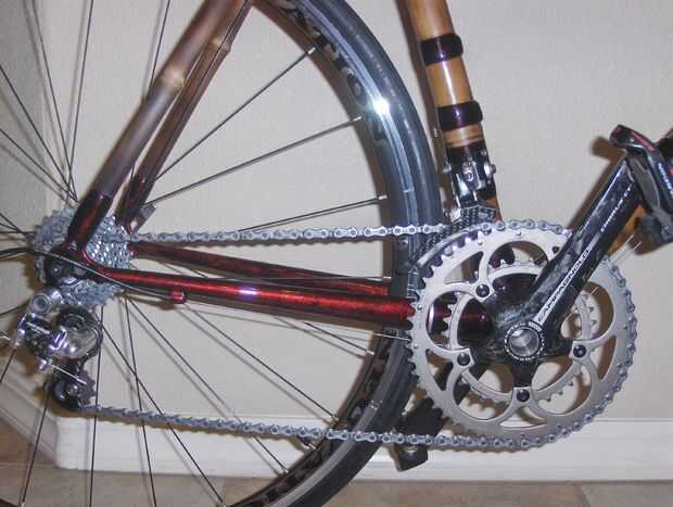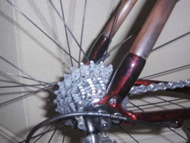 A continuación instalé la cadena y ruedas. Y otro problema se presentó. En un esfuerzo para que las punteras traseras ves fresco, envuelve a la deserción driveside (vaina) excesivamente. Esto impide la cadena cuando cambio en el piñón más pequeño en el cassette de 10 velocidades. ARGHHHHHHHHHHHHH! Lo que sea, hacia fuera viene el raspador! Tallado un chanel para la cadena, y realmente se ve muy bien. Único problema es, es negro en el canal y no pintadas. Bueno, está en un lugar que woud has metido aceite por todas partes alguna manera! Apenas más perfecto para la próxima.