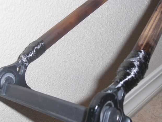 Este es el paso menos complejo de todos realmente - colocar tubos de bambú y algunos resina se aplican a la interfaz de bambú y metal. Yo, para el refuerzo, también envolver una cantidad de smal de remolque/cadena de carbono sólo para asegurarse de que todas las estancias en el lugar. Después de todo todavía voy a ser eslingado esta cosa alrededor de todo un poco y cuting más pedazos hacia fuera. Lo quiero a permanecer juntos!