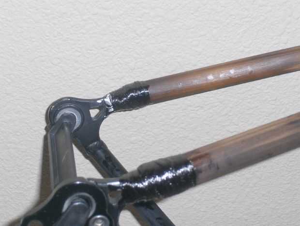 Ahora que el ajuste inicial se ha completado en los primeros miembros de la 3 estructura - tubo superior y 2 triángulo trasero abajo de tubos/postes, puedo adherir a las superficies metálicas y tomar para cortar el resto de los miembros de la estructura de metal para reemplazar con cañas de bambú.