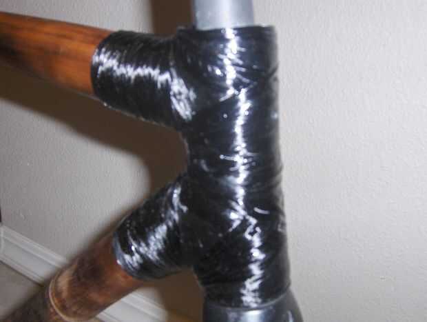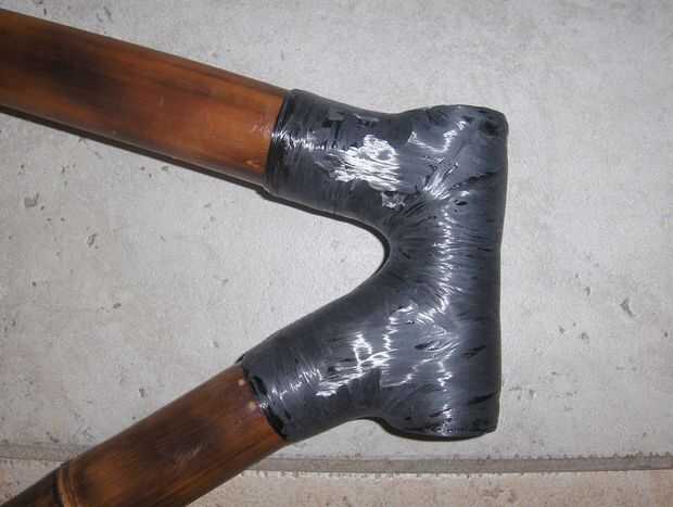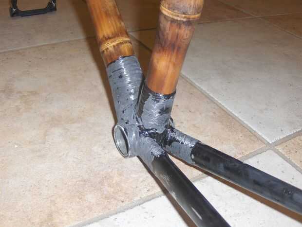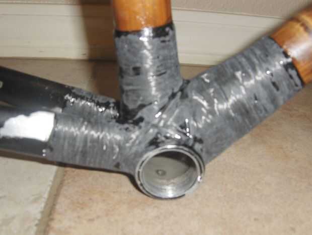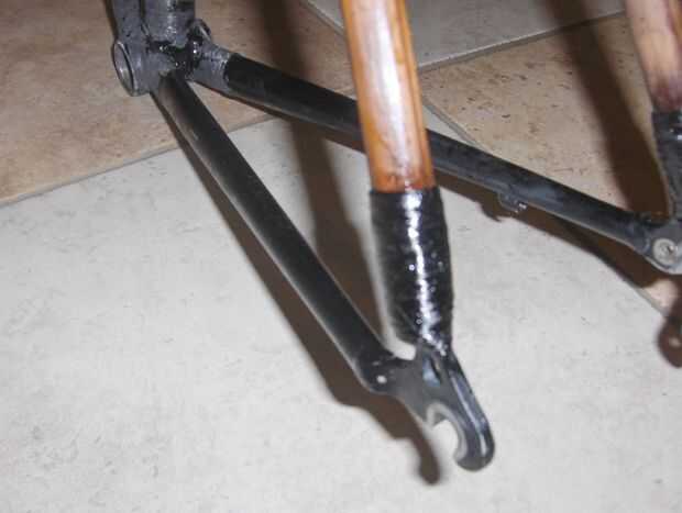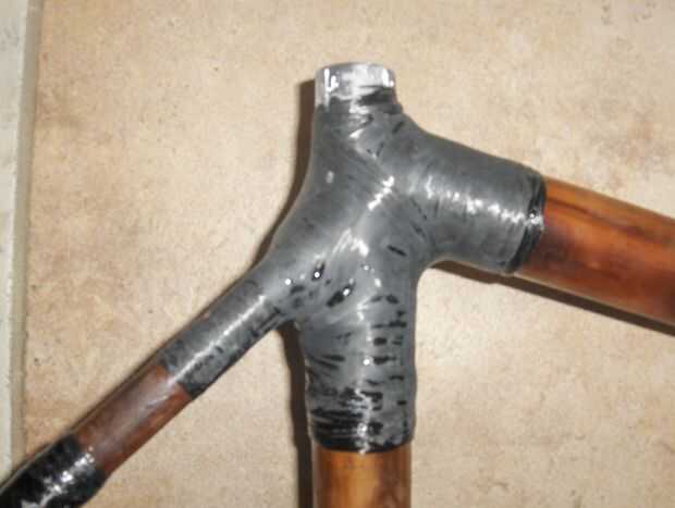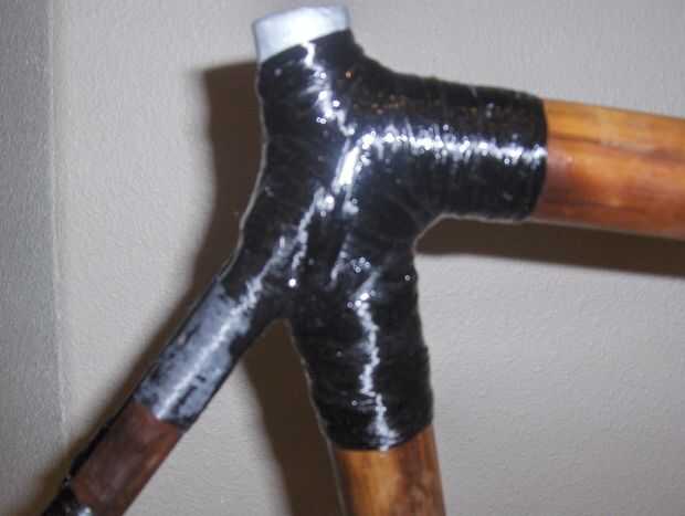 Me seco había equipado el montaje de freno y la rueda otra vez y fue dentro de la tolerancia a mezcla algunos resina y comenzó a envolver el puente de freno en su lugar. He atravesado varias veces entonces envuelto para arriba y abajo el bambú y el puente - principalmente para mira de remolque entre el aluminio y bambú y uniformidad, pero también para construir la articulación, tanto por el bien que hace la real articulación fuerte, pero también para dispersar el frenado de la carga más de la estructura vertical de bambú.