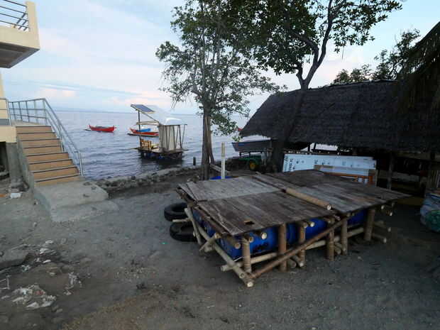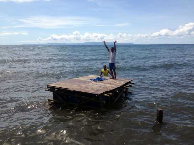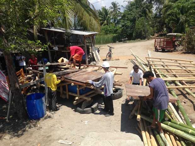 Pone algunas placas planas en la parte superior del marco flotante. Estos pueden ser de bambú que aplane en tiras finas, o hemos rescatado algunos contrachapado marino de un barco anterior.