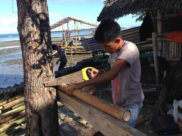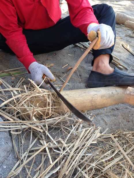 La primera forma en que los constructores de barcos conectan principales estructuras de soporte de bambú es haciendo uñas de bambú sí mismo!