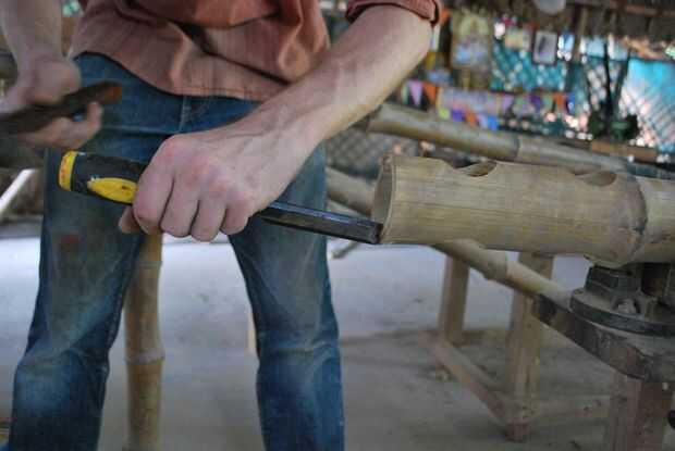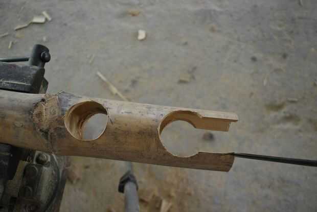 Asegurándose de no acercar demasiado al tamaño completo del primer agujero, utilice el cincel para cortar algunas piezas en el extremo de la pieza de bambú. Finalmente se trata donde esta pieza se une a otro.