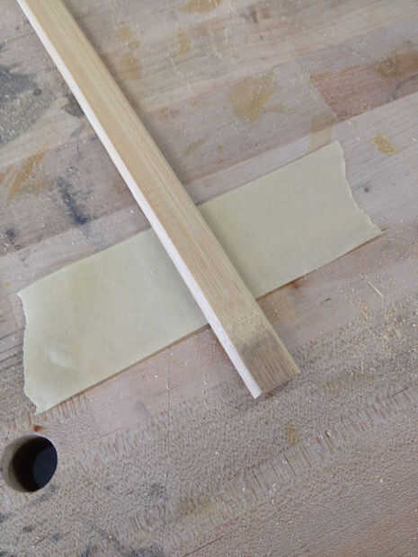 A continuación, utilizar un router de 30 grados del pedacito para biselar los bordes. Configurarlo en una mesa de fresadora, o utilice una plantilla simple para mantener el bambú. El router le da una buena limpieza pegado borde. Entonces cinta de 6 de estas tiras junto a-borde con cinta de enmascarar.