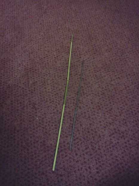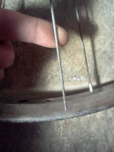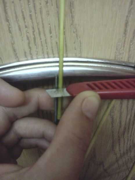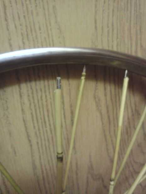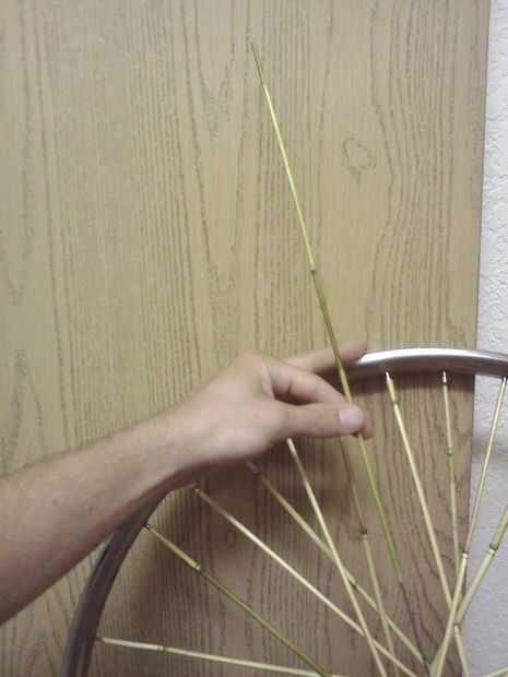 Nota: si no has hecho habla del cordón antes de que te recomiendo hacer este uno habló en un momento y repetir esto y el siguiente paso para cada rayo individual, o usted puede terminar con mucho más trabajo y frustración que había planeado para.                                                                                                                                                                                                               Primero retire el niple del rayo sacando desde el lado de la llanta de la rueda. Luego cortar un trozo de caña más larga que la habló, estas cañas son delicados por lo que la caña extra permite recortar más tarde. Después de que el rayo puede sólo Desenroscar y empújelo a través del centro de la caña. Esto puede tomar un poco de movimiento de golpear o atornillar realmente los hilos del rayo a través de los nudos de crecimiento de la caña. tomar otro rayo o un dispositivo de medición y recortar el exceso de la caña dejando espacio para el pezón ser reemplazado.                                                                                                                                                                                                     Pro tip: tomar la cinta eléctrica y ponga en la caña en el lugar que desea mantener y cortar en el borde de la cinta con una rueda para una herramienta dremel o rotatorio de corte Esto evitará que la caña de partir tan fácil y le dará un mejor corte.