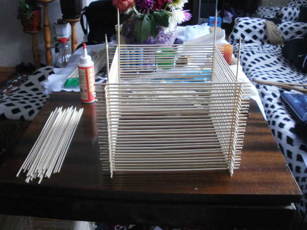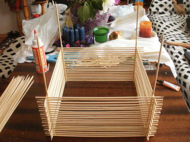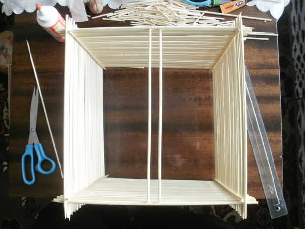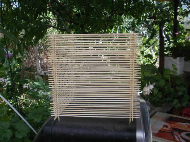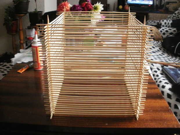 Esta era la parte más sencilla izquierda y la más rápida. Todo me quedaba para hacer fue terminar la lámpara. Lo he dejado 2 cm las puntas de las brochetas verticales para el efecto ornamental y he vuelto boca abajo, porque se trataba de la parte inferior de la lámpara. en la parte superior he pegado 2 piezas paralelas para hacer el cableado y el montaje del bulbo más fácil.