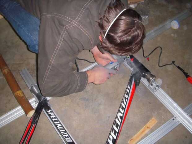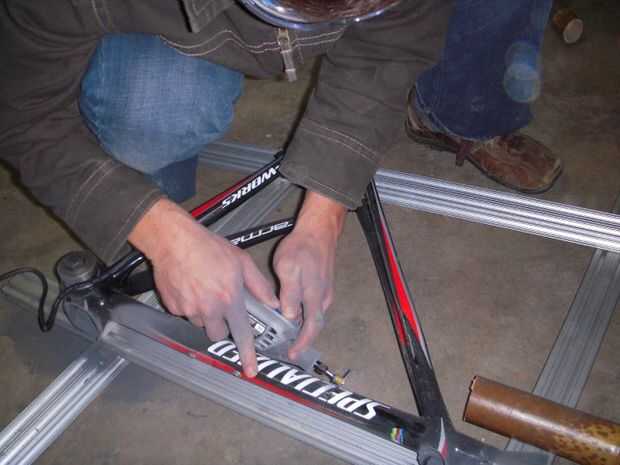 Con esto en mente, nos sacó los tubos para ser reemplazado por el bambú. Otra vez, no tenemos los recursos técnicos hasta las salidas posteriores, (si habíamos usado Misumi protuberancias nos) así nos salvó el triángulo trasero. Nos salvó también el área de abrazadera del tubo de asiento, así que el tubo del asiento tendría una interfaz agradable.