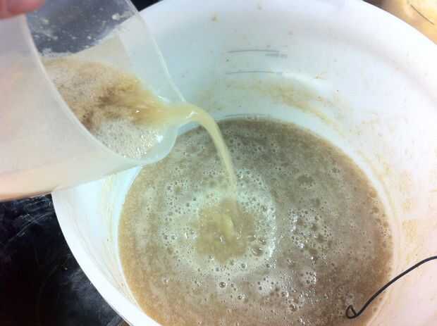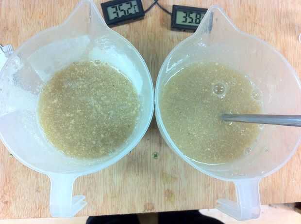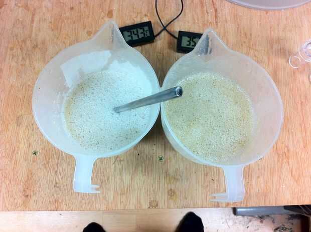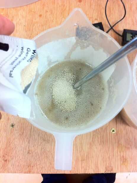 Añadir la levadura a las jarras, un paquete de 5g cada una jarra y revuelve en dejarlo hasta los fermentadores para la temperatura de trabajo de la levadura, dan las jarras un buen revuelo y vierten a los fermentadores.