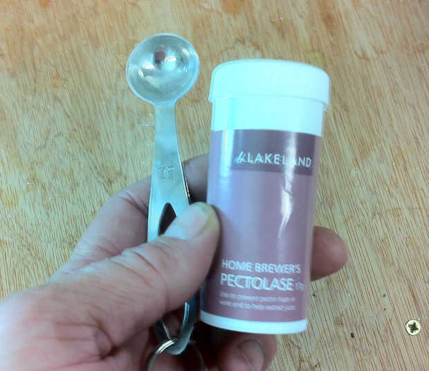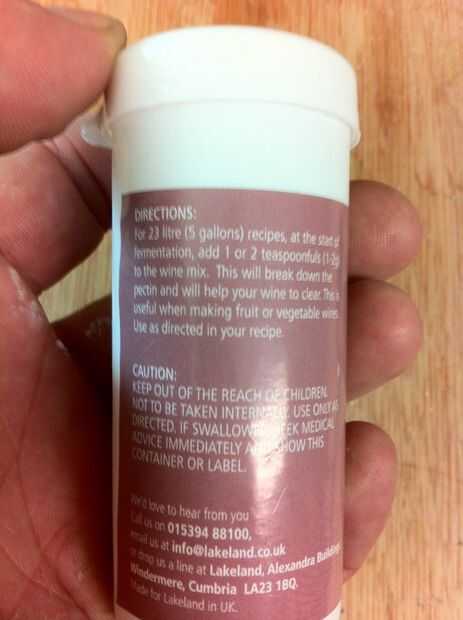 También puede Agregar pectolase, esto se utiliza en vino para ayudar a que el vino claro, convierte la pectina en una forma que puede consumir la levadura, otra vez esto es opcional pero lo que veo más la levadura puede usar mejor. Otra vez, lea las instrucciones sobre su pectolase antes de agregarla.