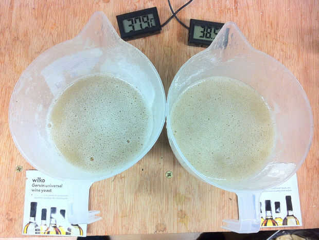 darle un revolver muy bueno, tratar de conseguir algo de aire en a si se puede, luego tomar el líquido de cada fermentador en jarras separadas y deje que se enfríe a la temperatura de trabajo de la levadura, lee el paquete para encontrar esto, usted debe poder tono EC-1118 alrededor de 30 grados c, si no sabes qué temperatura la levadura se debe tratar a 22 grados C en la caja fuerte lado.