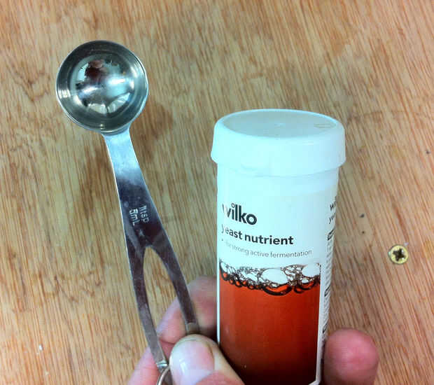 Ahora puede agregar nutrientes de levadura al fermentador, lea las instrucciones de la cantidad a agregar, esto es opcional ya que probablemente hay bastantes de los plátanos.
