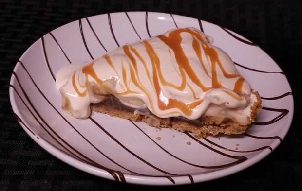 Esta torta es una capa de cremoso de chocolate, seguido por una capa de pudín de plátano y cubierto con crema batida dulce.