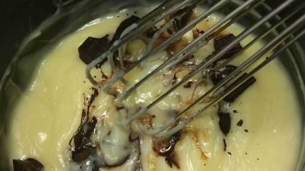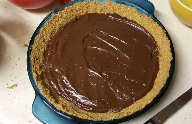 Dejar reposar unos minutos, luego vierte en su corteza. Cubierta con el abrigo plástico tocar chocolate mezcla (para evitar que la piel formando) y colocar en el refrigerador se enfríe completamente.