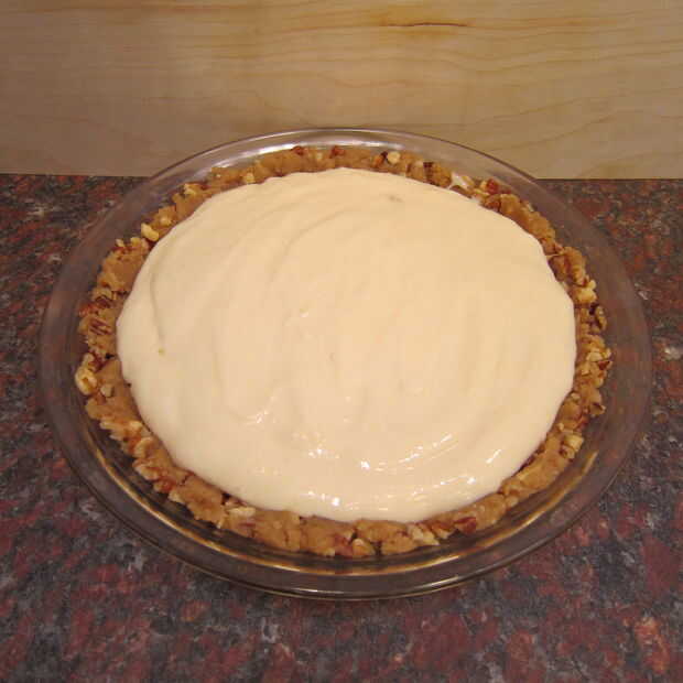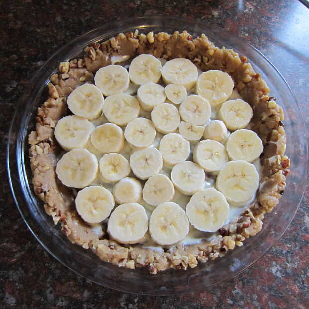 Capa de rodajas de plátanos en la parte inferior de la tarta. Vierte la mezcla de pudín sobre la parte superior. Coloque en el refrigerador.
