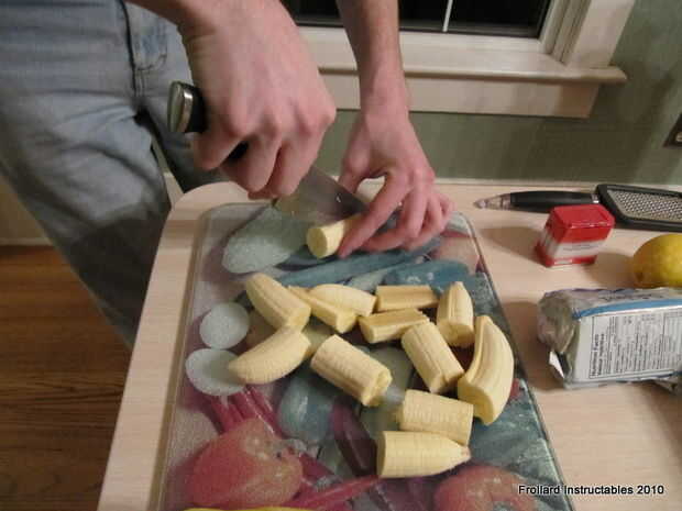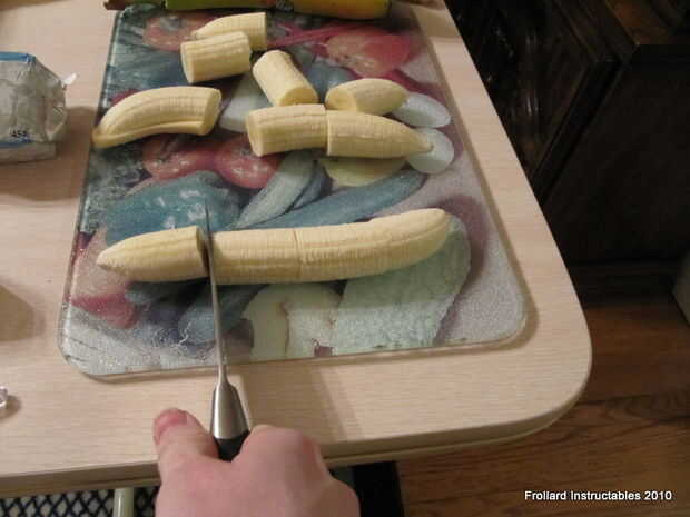1. Cortar las bananas en trozos de su tamaño preferido, encontrar bisecan (como una banana split) a lo largo, luego cortar en 8 trozos total rinde un buen tamaño.