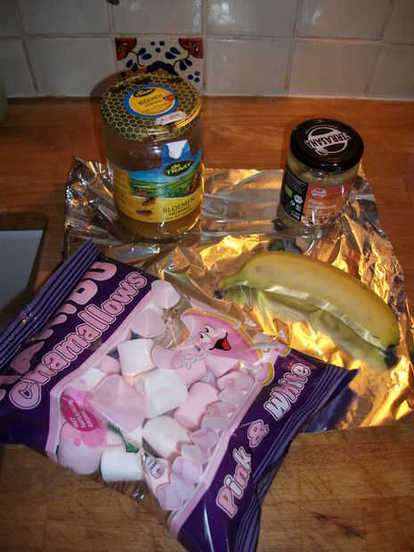 Bananabarbequeboats de manteca de cacahuete de marshmellow con honeydip (1 / 4 paso)