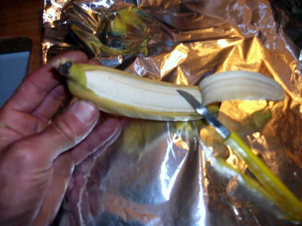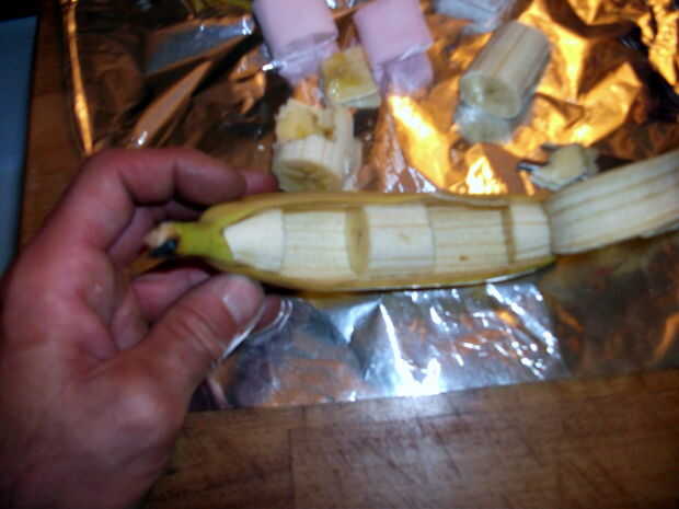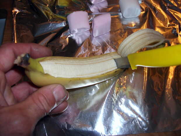 Bananabarbequeboats de manteca de cacahuete de marshmellow con honeydip (2 / 4 paso)