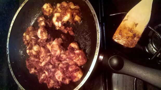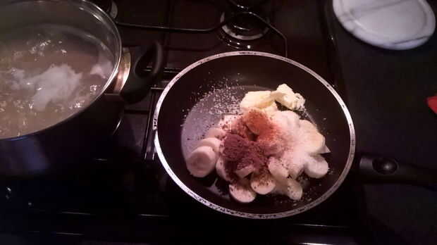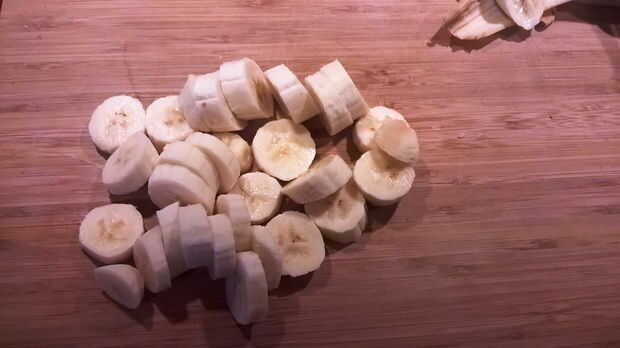 Luego corte dos plátanos en rodajas. Ponerlos en una bandeja. Agregar suficiente mantequilla, coco rallado, cacao (que habría utilizado el cacao puro en polvo, pero sólo había polvo de bebida de cacao instantáneo, que también contiene azúcar y toneladas de todas las cosas que ponen en los alimentos industriales sin razón aparente) y Cayena/guindilla al gusto. Añadir suficiente por lo que se siente, ¿por qué ponerlo en otra manera? No es necesario añadir azúcar, los plátanos son lo suficientemente dulces para sí mismos.