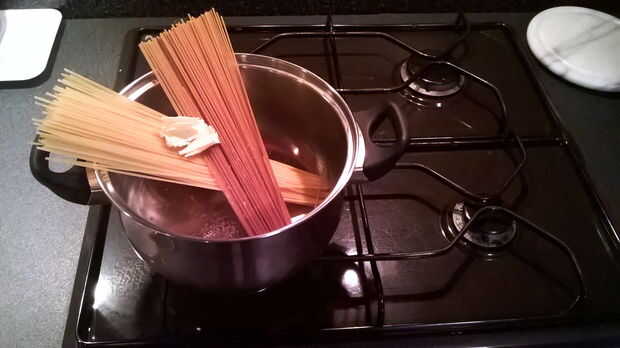 En primer lugar, usted necesita cocinar unos espaguetis. Usé la mitad de trigo duro y medio integrales. Echan en agua hirviendo con un poco de sal y un poco de mantequilla. Hervir durante 8 minutos tal vez, hasta obtener la consistencia deseada, entonces cepa.