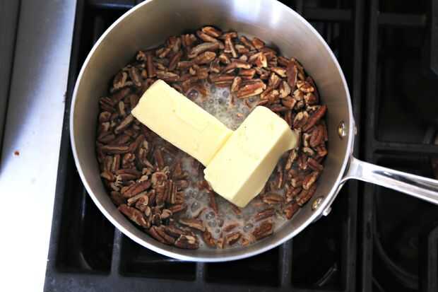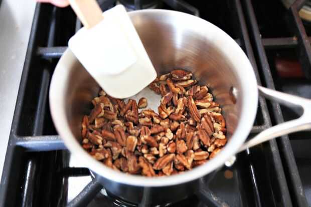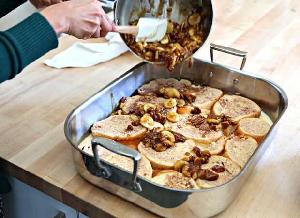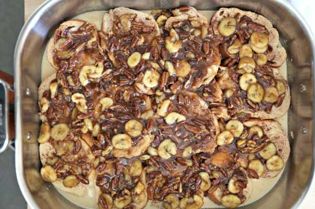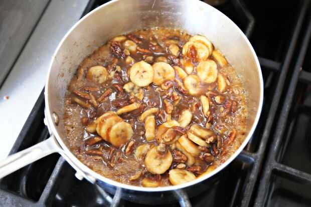 Cacerola freír las mitades de nuez durante 5 minutos. Luego, tiro en mantequilla y azúcar morena. Permite el azúcar a fundir a mantequilla (unos 5 minutos) y lanzar su plátano picado Revuelva por 2 minutos. Tomar calor y verter inmediatamente sobre rebanadas de pan.