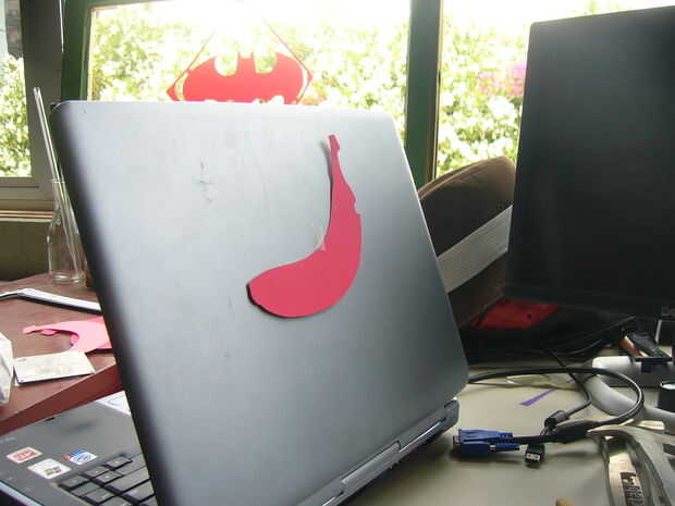 Antes de cortar nada importante, hacer una plantilla. Cortar archivo de vector de papel y compruebe para el mobiliario. En mi caso, necesitaba cubrir el hundido en área que la antigua marca de laptop - esto determina el tamaño de mi nuevo logotipo.