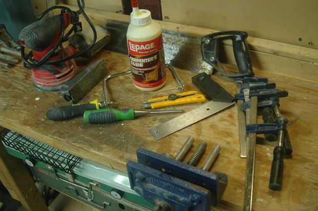 En cuanto a herramientas, necesita varias pinzas (abrazaderas especialmente mesa que serán útiles al cortar las colas de la paloma), un cepillo de desbaste, cinceles, archivos, cuchillo del exacto, pegamento de madera, rompecabezas, Sierra regular y una sierra de marquetería. También encontrará una ingletadora muy cerca, así como algunos bloques de lijado, archivos y las herramientas habituales.