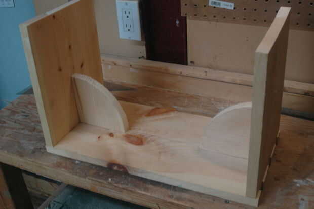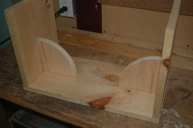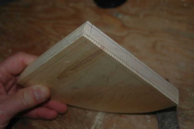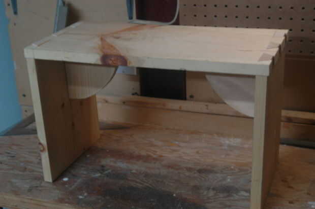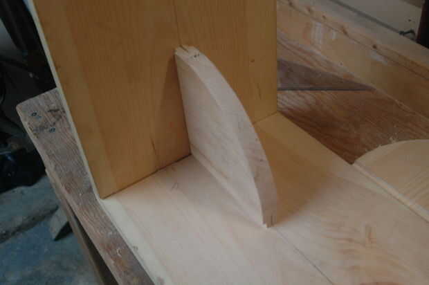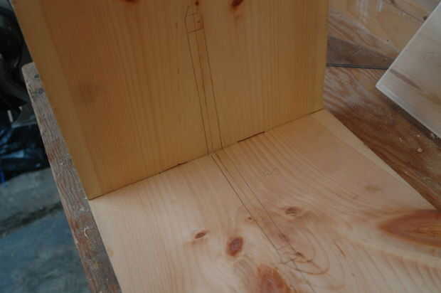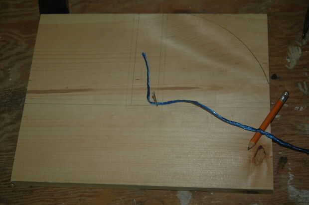 El proceso iniciado por trazar la forma que quería por el apoyo y dejando un margen extra de 0,25" en los lados tocando el asiento y la pierna. La curva de la ayuda se logró colocar un clavo en la esquina, colocar un trozo de cuerda y trazar el círculo cuarto en el borde.