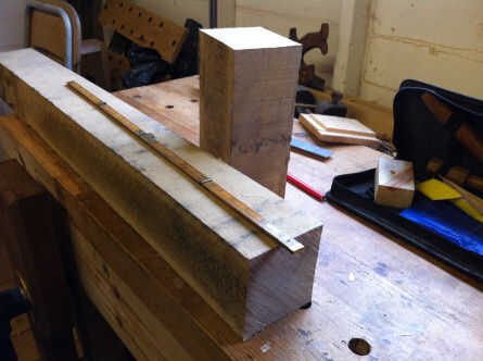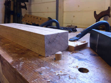 Empecé con un roble para la construcción principal. Esto comenzó como un durmiente de roble y en algún momento fue rasgado abajo en un post de 4 × 4: