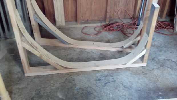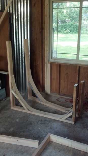 En vez de construir como una rampa de patineta tradicional con costillas de madera contrachapada y apoyo, surgió esta idea de utilizar corte 2 x 4 y construido en forma de J y reforzar las esquinas con madera de corte a 45 grados. Esto ayudó a fortalecer todo para arriba, pero también dio un buen punto en la curva para poder atornillar en este pedazo de madera en la parte superior. Si recuerdo bien, yo apenas arrancó algunas más 2 x 4 para ayudar a crear las curvas. Unos tornillos en el lugar y fue buena.