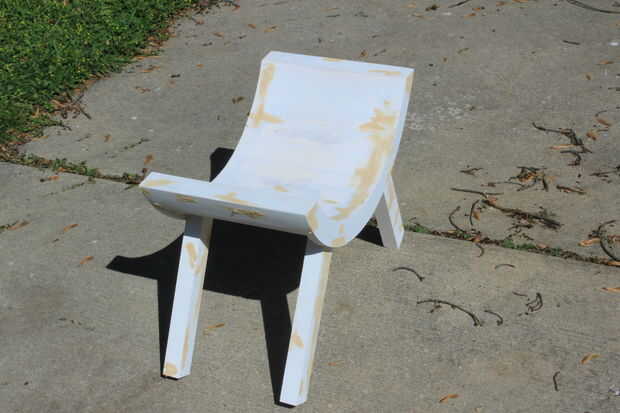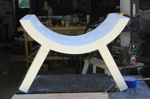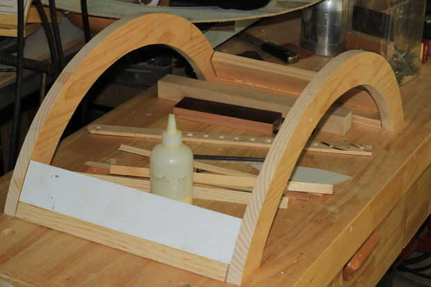Luego corte el pasamanos y pegados y atornillados los carriles de mano en la parte delantera y trasera Marcos así como unas costillas para el doblado de 1/4" plywood.after dejando el marco seco durante la noche, corté un pedazo de 1/4" madera contrachapada de la curva superior (la sede).