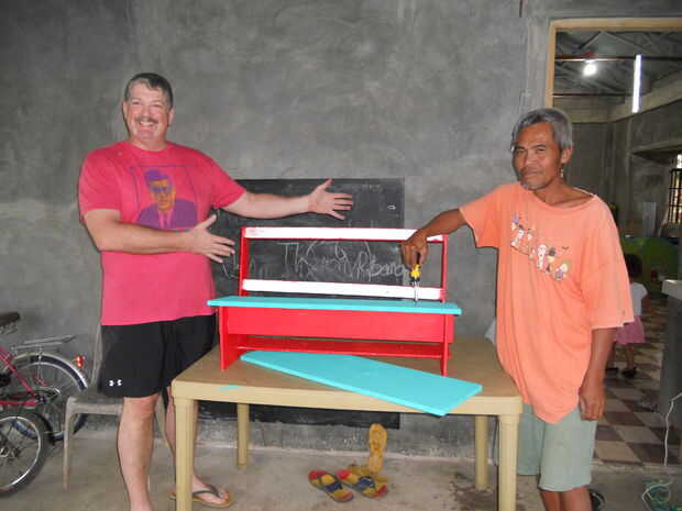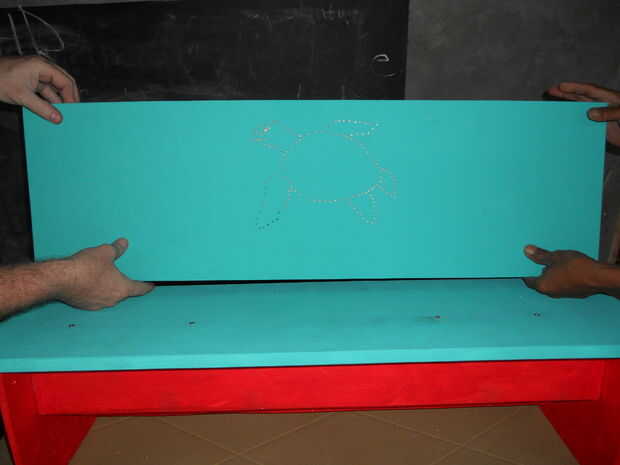 Y rompió una línea de tiza (naturalmente) para ver donde nos debemos taladrar los agujeros para los tornillos evitar errores embarazosos.