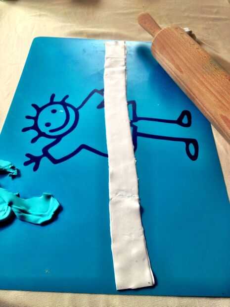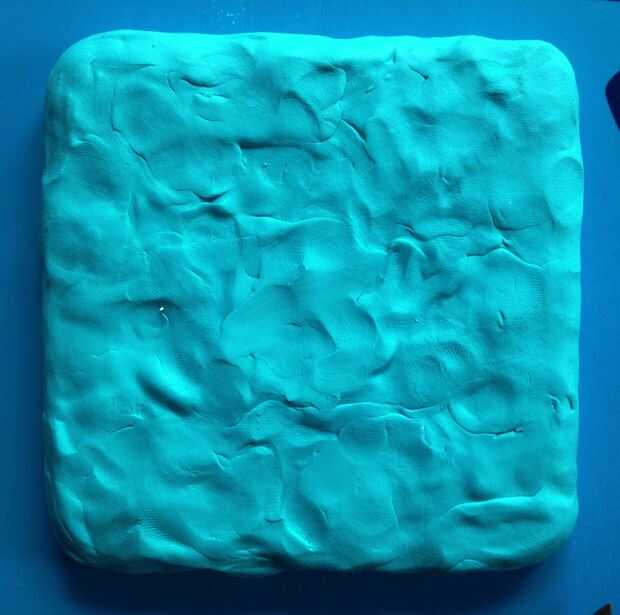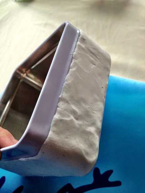 En primer lugar, difundir la arcilla del polímero a un grosor de unos 2 mm (un poco menos de 0,1 pulgadas). Hice FIMO blanco por los bordes de la piscina, para darle un aspecto de azulejo-como. Por el agua, tome FIMO azul. Tomé una pieza que fue un poco menor que el área de la caja, para poder estirar un poco el FIMO y ajustar su tamaño perfectamente.