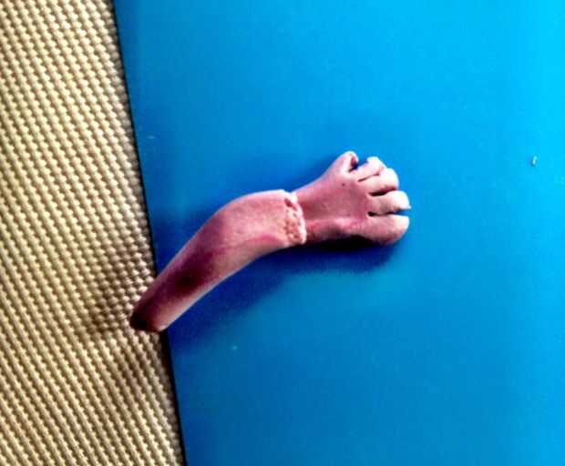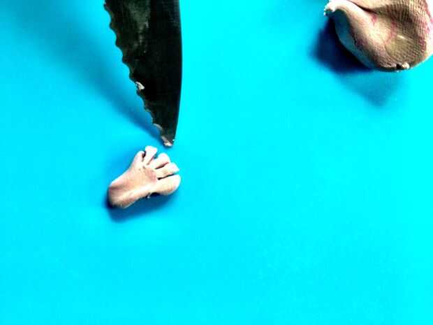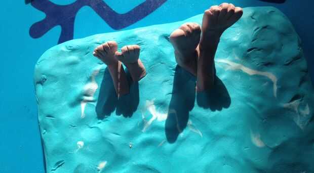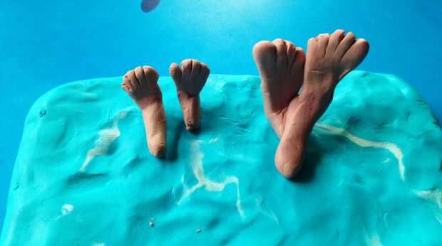 Forma de cuatro pies de FIMO mixto. Hice a pies pequeños y grandes, para representar la diferencia del tamaño de los pies en la vida real:). Luego coloque los pies en el agua en un lado de la caja. Una vez que estés feliz con la posición, puede suavizar la transición entre los pies y el agua. Pero usted puede esperar con ese paso hasta que las cabezas se colocan demasiado.