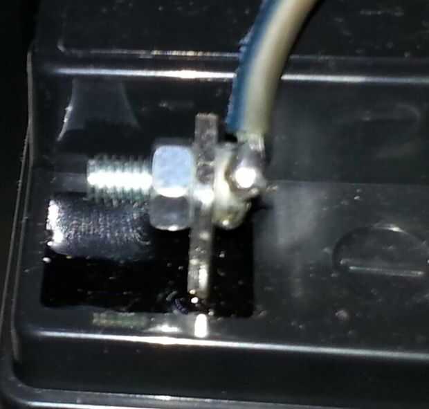 Del mismo modo para el polo negativo de la batería apretó una tuerca y un tornillo. La cabeza de este tornillo había soldado un cable directamente.