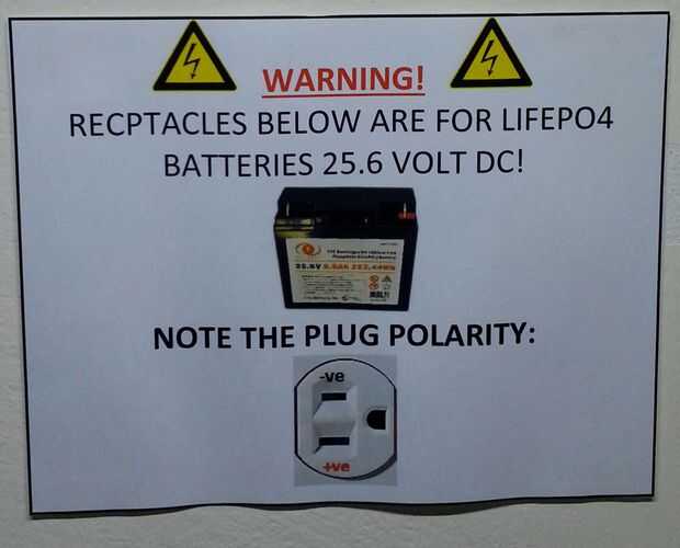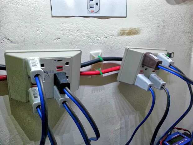 Usé dos salidas estándar nema-15r con 6 salidas. Tenga en cuenta que esto no es un uso estándar para dichas salidas sin embargo puse un cartel para advertir de los efectos de estas salidas. Las ventajas de este arreglo es que yo puedo con seguridad dentro y fuera de cualquier grupo de la batería sin afectar al resto de la red.