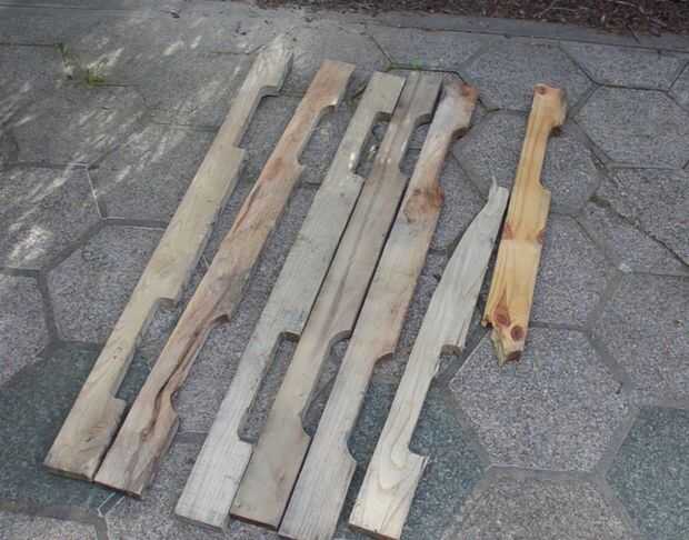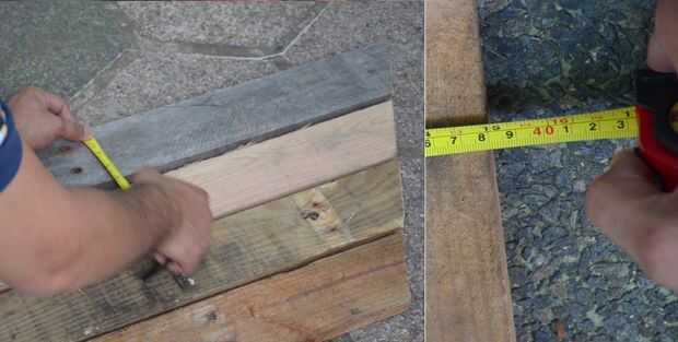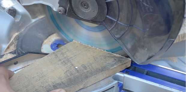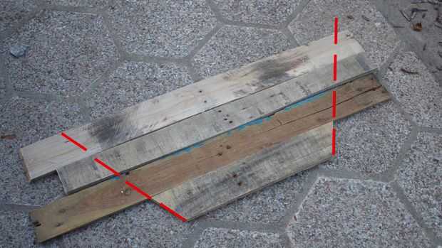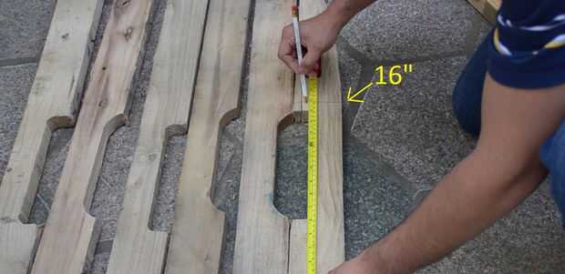 Después de romper las plataformas para obtener las placas de cubierta individuales, usé el valor 16" de los dimensiones calculadas dos pasos anteriores. Hice un 30° corte en ambos lados de la Junta para, esencialmente, un trapezoide (con el lado corto que 16"). Yo entonces alineado tres tableros de cubierta más junto a esa primera junta que había de cortar. Con una regla y un lápiz extendió la línea donde hice 30° corte. Hice esto para ambas partes. Estas cuatro piezas hará que uno de los seis asientos/lados del Banco. En este punto usted tendrá 24 piezas usables.