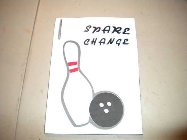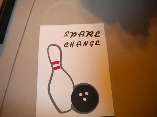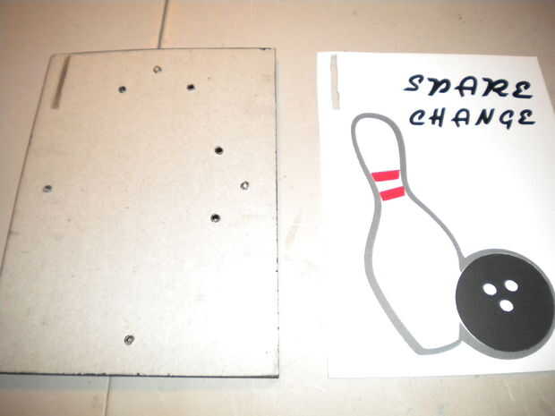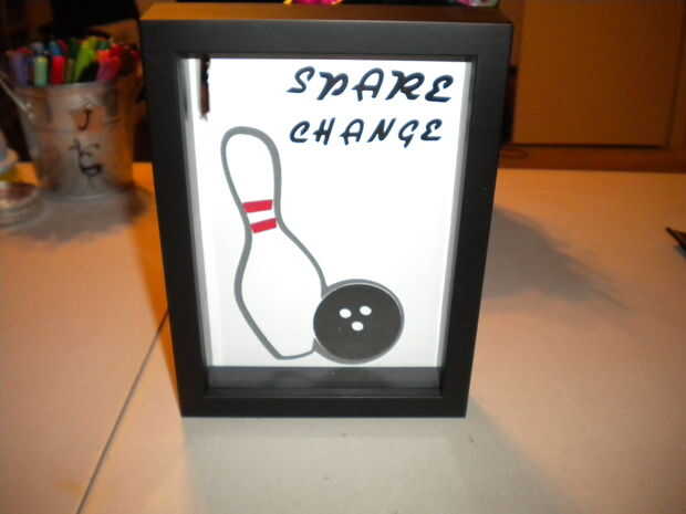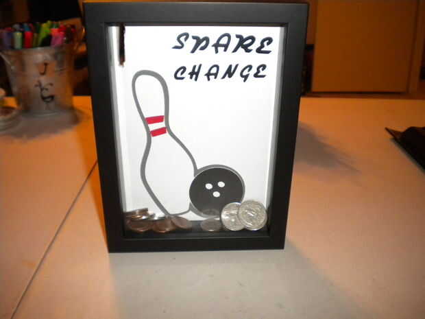 para hacer de este banco, empecé con una caja de sombra de 5 x 7. Solía mi cortadora de expresión Cricut y el cartucho cincuenta Nifty para cortar un pin de bowling y título para el interior. Coloqué mis cortes en una hoja de cartulina blanca cortar para caber la caja de la sombra. Una vez que tenía este corte, utiliza un lápiz para hacer una marca en la parte posterior de la caja de la sombra y en el corte para el cambio caber en la caja. (Asegúrese de que esto sea lo suficientemente grande como para que un cuarto se puede caber a través de) A continuación, una vez que éstos fueron cortados, solía un corredor de cinta Coloque mi inserto decorativo en la parte posterior de la caja de la sombra. Entonces, lo pongo nuevamente juntos y estaba dispuesta a añadir cambios a.