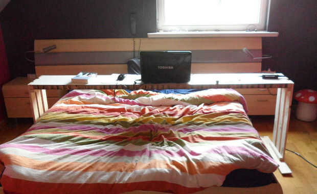 Este banco de la cama se hace con una tabla encima de su cama. Muy fácil de ver películas, trabajar en su computadora, comer el desayuno, poner libros, bebidas, alimentos en él... Cuando estés listo para dormir, simplemente empújelo en el extremo del pie.