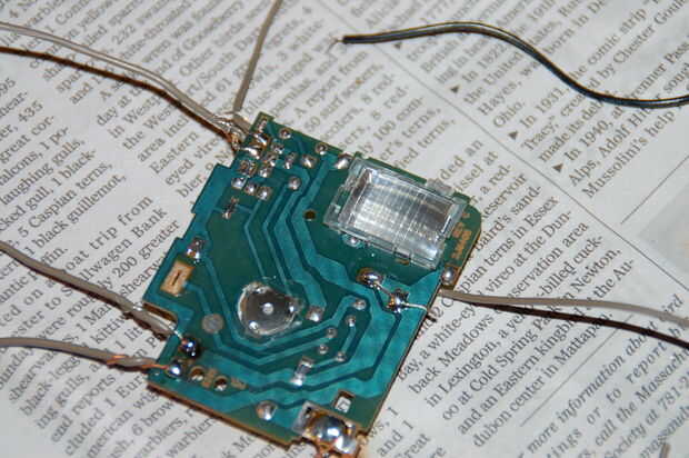 Asumiendo que tiene un LED en el circuito de carga, vamos a ver las partes importantes. Son los contactos de la batería, + 1, 5V y tierra, el LED hacia fuera, ~+2.8v y tierra y los contactos del condensador, + 480v y tierra. También queremos deshacernos de la lámpara de xenón, añade un montón de espesor.