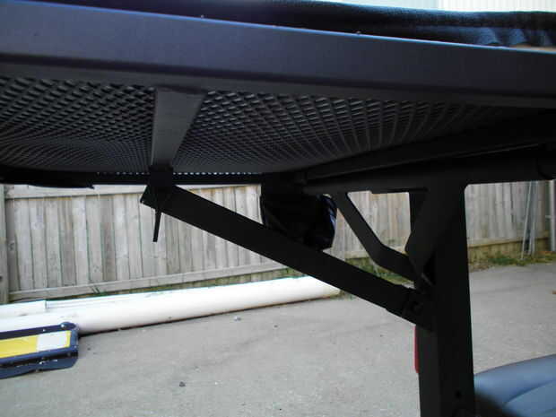 La tabla gira sobre una columna central y es apoyada por un 1-1/4" tubo cuadrado fijada Longitud brazo de soporte.  Este brazo de soporte está fijado a un soporte en el centro de la mesa y sujeta a la columna del centro por un perno de bisagra.  Mi solución fue quitar el brazo de soporte de longitud fija y reemplazarlo por un ajustable.