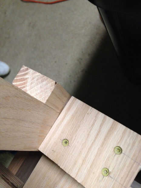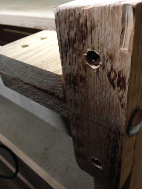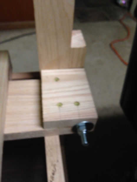 He encontrado 2 piezas de 1-1/2" chatarra y poner en la parte posterior de las piernas para evitar hacer la bisagra más fuerte. Perforé a través, encontrar el centro de estas nuevas tarjetas aseguradas y taladrar un orificio de 3/8" hasta dos tableros a la cima de las tablas pivotantes que son 1" por 4" por 3" y aseguró con 3 tornillos tiros. Usé un 7" 5/16" tornillo y tuerca para hacer la bisagra. es más que suficiente para mantenerlo en su lugar. ahora es el momento para esa tabla que es 5" por 1" de 4'6 "y asegurado directamente debajo de las tablas de asientos que llegan a ayudar a apoyarlos, irá entre los dos mucho las piernas al frente del Banco y sentarse a nivel con las placas laterales.