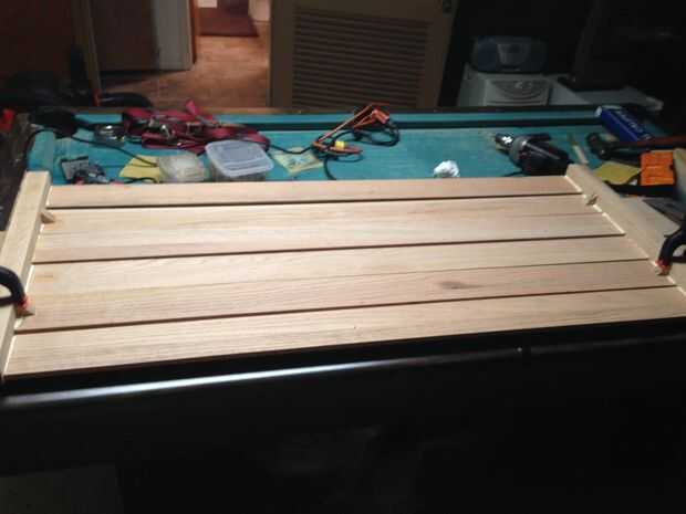 Se alinee los extremos de las placas en un lado y hacer un agujero y taladro 1/4" de la parte delantera de la pierna y 1-7/8" desde el final de la parte superior de la pierna, los agujeros son 4" aparte y hay 6 de ellos, perforar el centro de todos los extremos de 1/2" tablas hará alinear a ras con la parte delantera de la pierna , existe un vacío de 1/4 de pulgada entre todos los consejos. Usé grapas pegamento y barra de madera para sostenerlas en su lugar y utiliza unos triángulos de madera para contener dos de las tablas que no querían permanecer en el lugar. hay un cuarto pulgadas distancia entre el tablero inferior y las tesis de piso son sus patas delanteras.