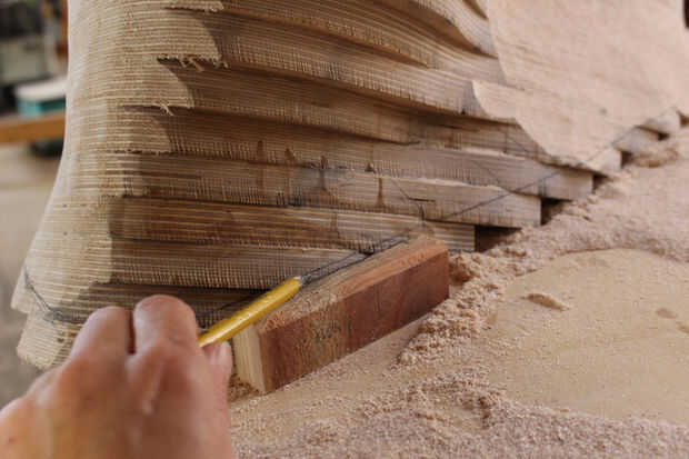 Esta parte fue un poco complicada. Los pies eran salir de alineación cuando finalmente conseguí vertical. Comencé con un molido áspero para hacer los pasos en la parte inferior de los pies planos. Mirando el boquete más grande, describen una línea todo el camino alrededor del pie, utilizando un bloque de madera más o menos la misma dimensión como la brecha. Luego he hojeado en uno de su lados, con cuidado material de tierra, hasta que llegué a la línea. ¡ Realmente funcionó bastante bien!