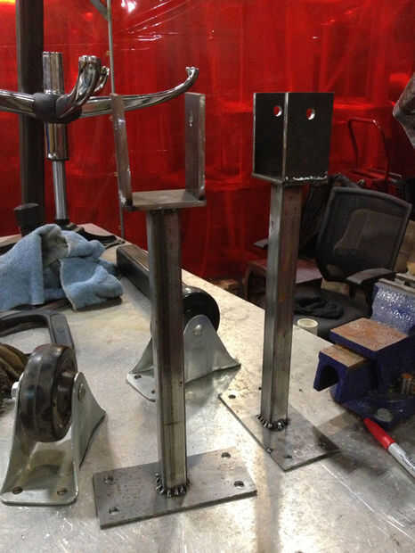Las patas de apoyo fabricado de tubo de 1" de acero y más de la hoja de 3/16". Las piernas tenían ruedas en un extremo, conectado a través de una placa soldada con autógena similar a la base principal. En el extremo superior, he diseñado una estructura de la abrazadera se ajuste bien alrededor de la espina dorsal central tubo cuadrado. Esta abrazadera tenía dos patas con agujeros cerca del final con el fin de estar bien atornillados firmemente alrededor de la columna vertebral cuando está montado.