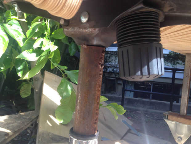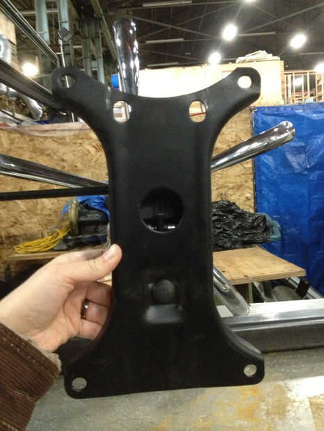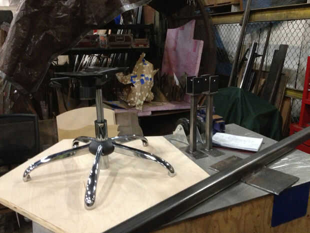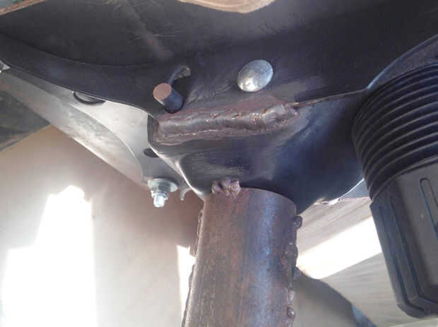 El Banco está soportado por una columna vertebral de 2" de acero del tubo que se extiende longitudinalmente a través de la base del Banco. En el centro de este tubo soldado una placa de acero de 3/16" para que coincida con la placa sobre la base de la silla. Estas placas se atornillan durante el montaje. Desde que el Presidente podría reclinar también levantado y bajado, soldó con autógena la base para evitar estas actividades. Para pararla de descanso, soldó con autógena la bisagra de la base de la placa en ambos lados. Para detenerlo bajando (que debe ser de altura completa), corté un tubo de acero la mitad longitudinalmente, poner el tubo vertical de la silla en el medio y soldando las piezas detrás - ver fotos.